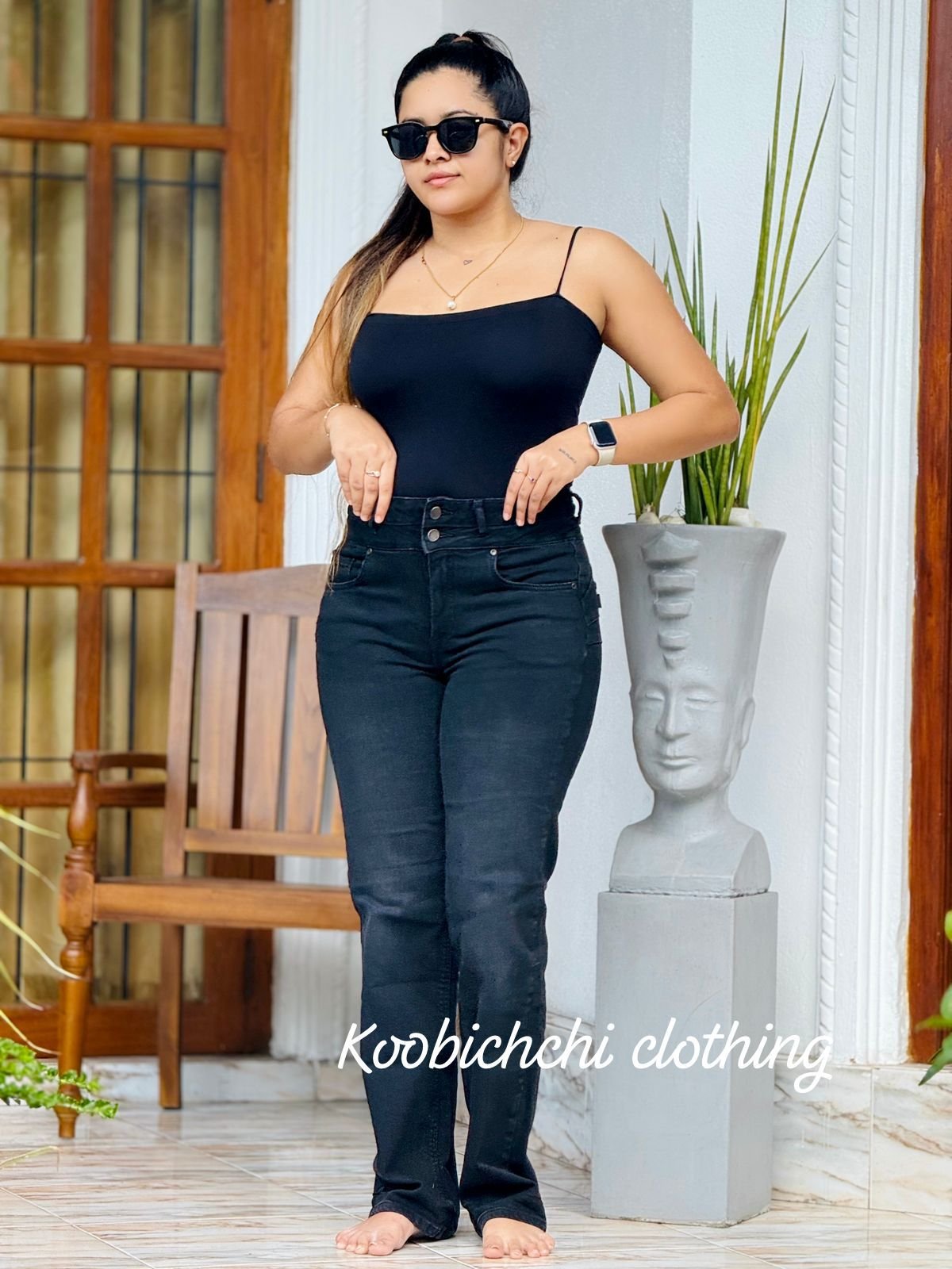 Ladies High Waist Black Washed Straight Jeans